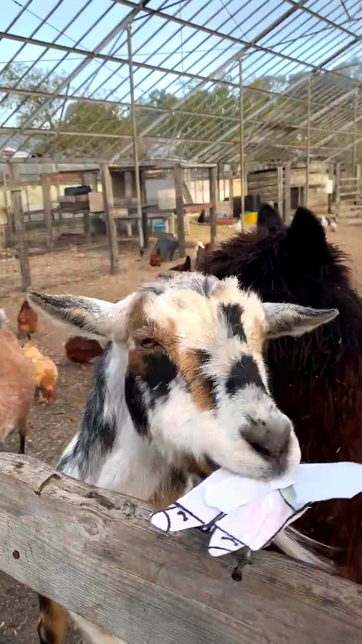 A man holds up a cutout drawing of Flat Stanley in front of a goat and llama at a petting zoo, and the goat eats it.