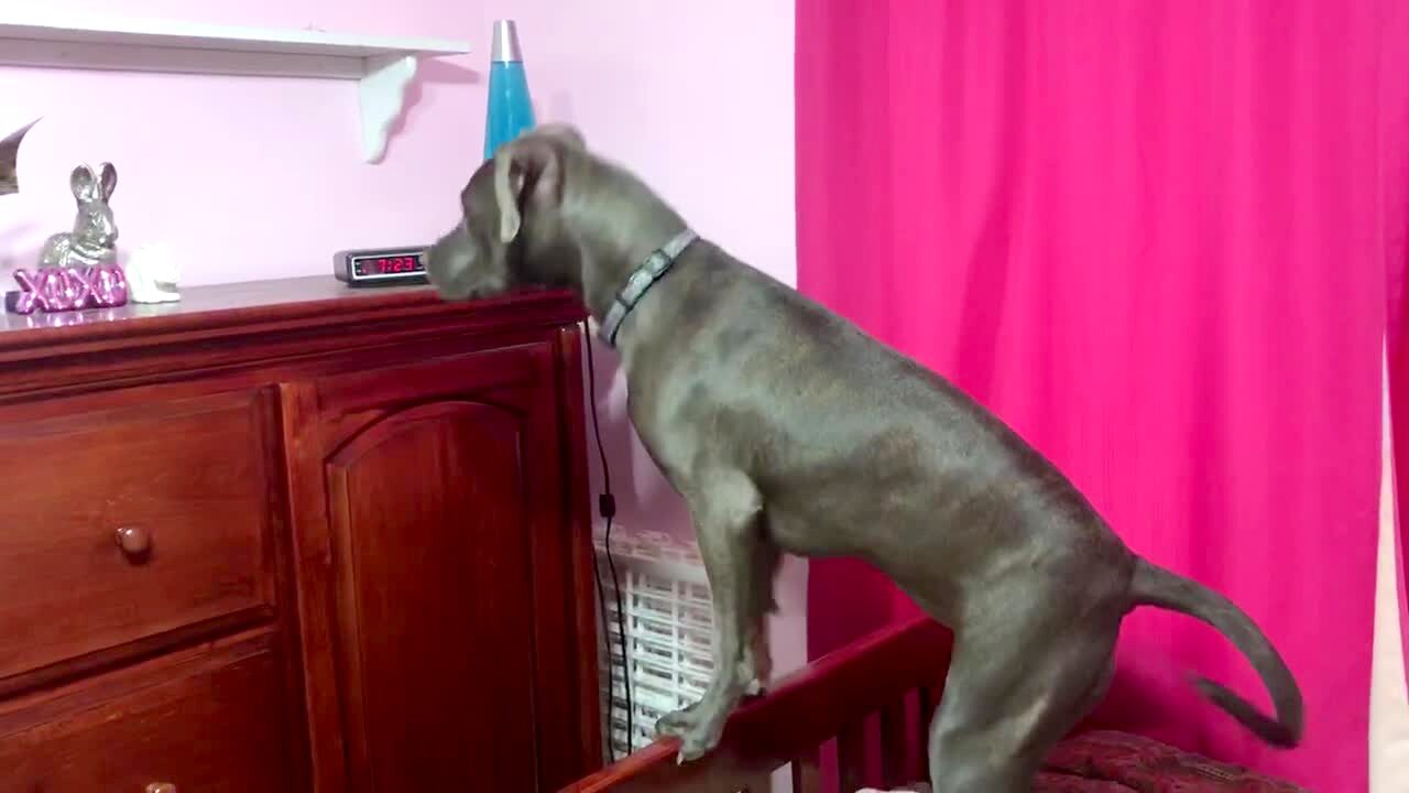 A dog whines while she stands with her front paws on the footboard of a bed and looks at a kitten cat on a dresser, then loses her balance and falls.