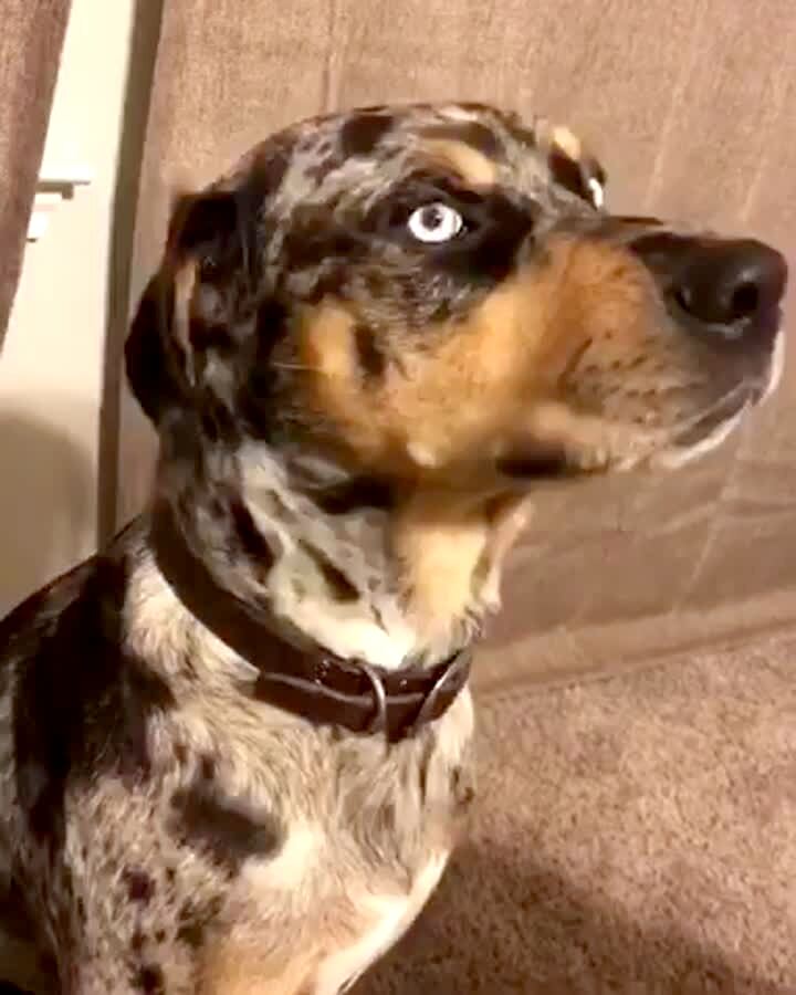 Cute puppy dog is sitting on bed. Shooter says "say something," and the puppy whines.