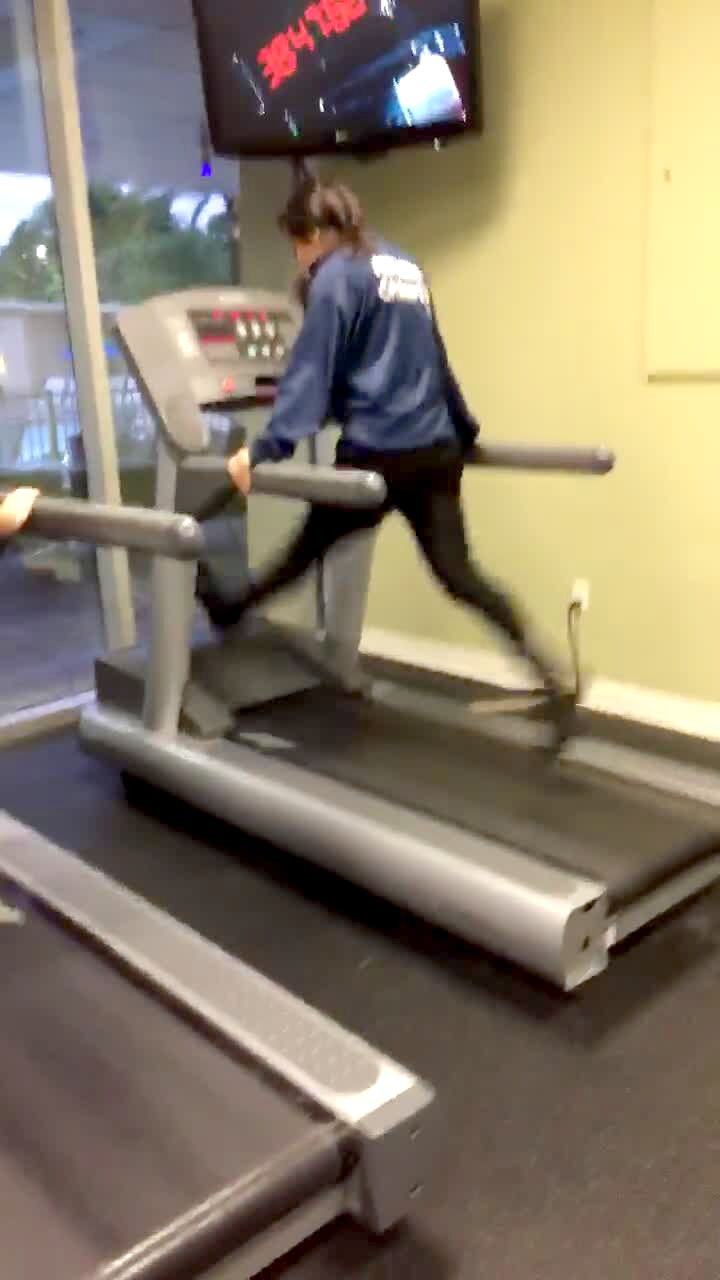 "Treadmill Spill" Two teen girls lay on treadmill, one stumbles and falls and slams into wall when she tries to step on to the running machine