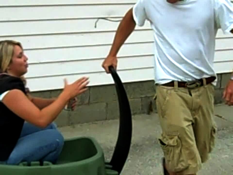 Man pulls his wife in a toy wagon across the driveway. He lets go of the handle, the wagon hits the grass & throws the woman out onto the ground hard.