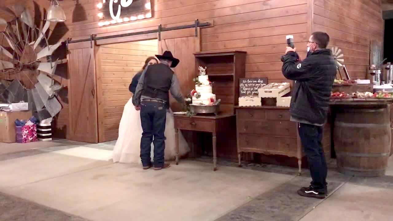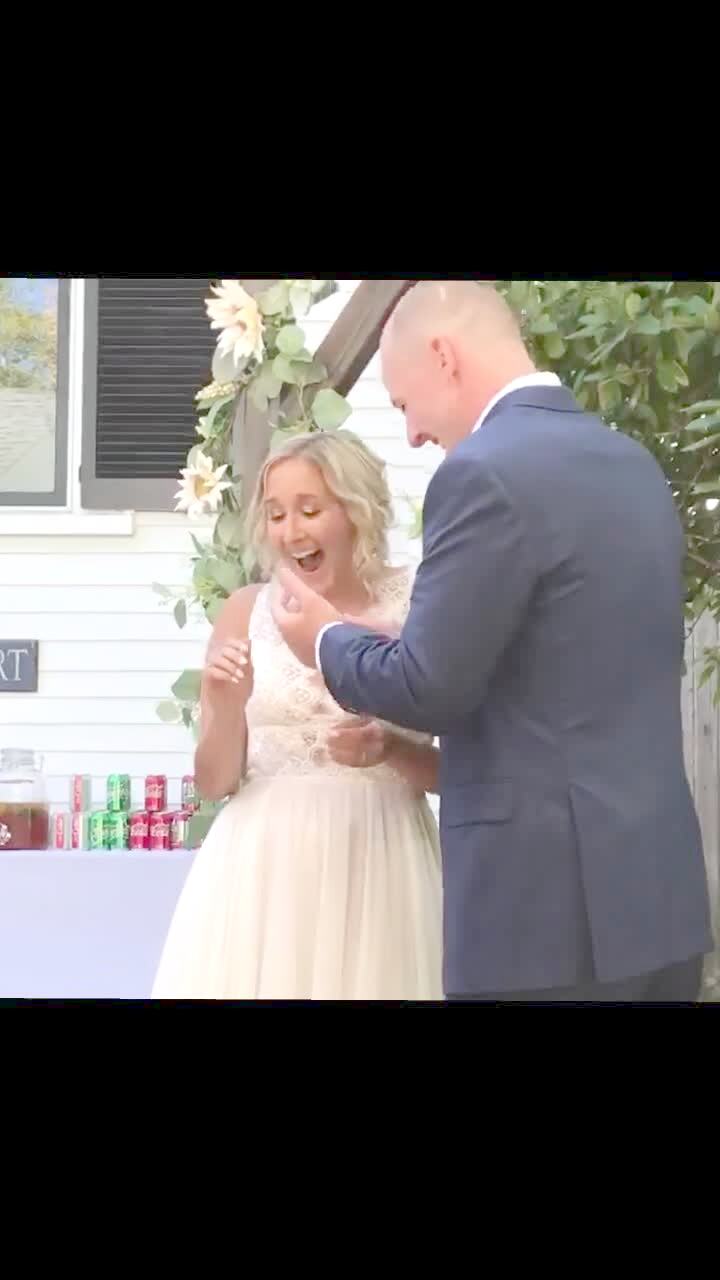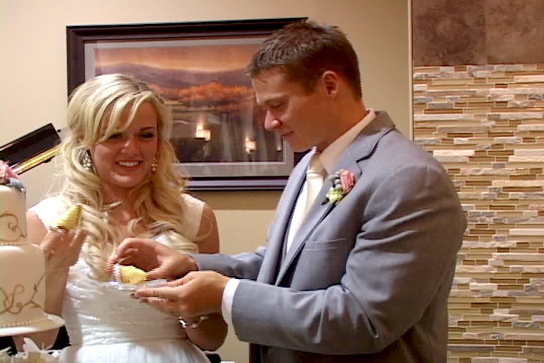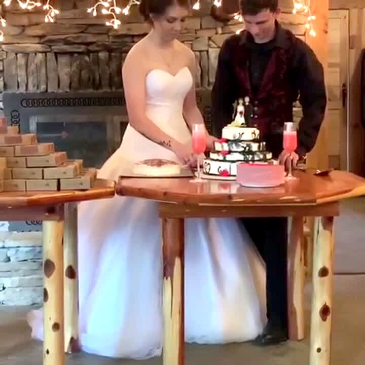 A bride at a wedding reception falls on her butt when she backs away from her husband as he tries to smash a piece of wedding cake in to her face.