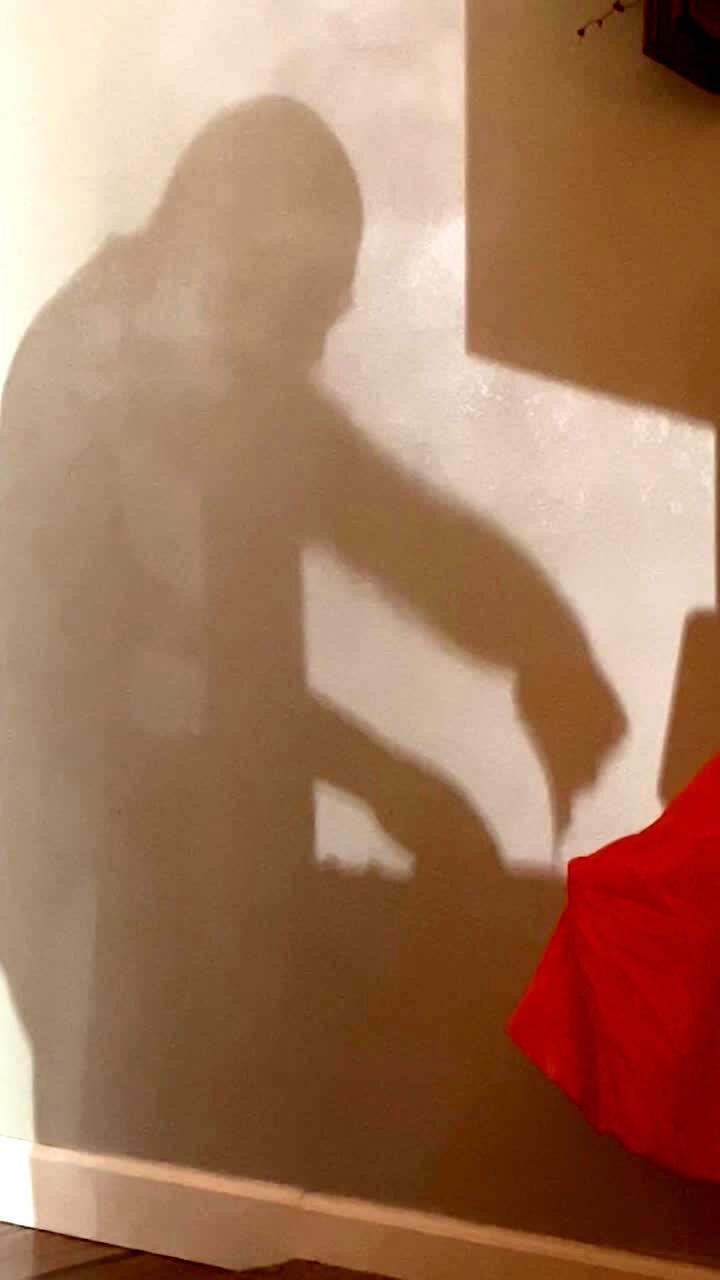 A man's shadow is seen as he eats cinnamon roll icing off of a tray in a kitchen. His wife asks what he is up to, and he says "nothing" and joins her in the living room.