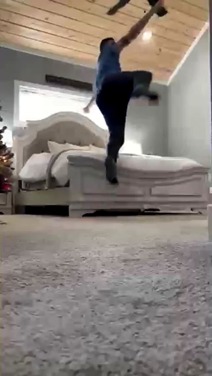 A woman in the bedroom sets up her bed to take a picture of it but just before she takes the picture, a man jumps on it. The wife gets frustrated and says "you're so mean." She makes the bed again and her husband jumps on it again. She says "I'm so pissed" even as she laughs.