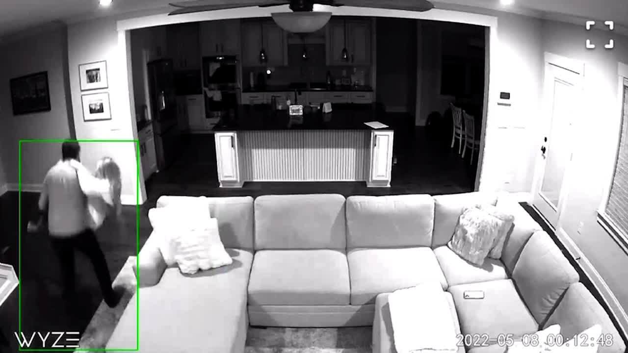 A husband tries to pick up his wife to carry her to bed from a living room couch, when he stumbles and drops her into a wall. Security footage.