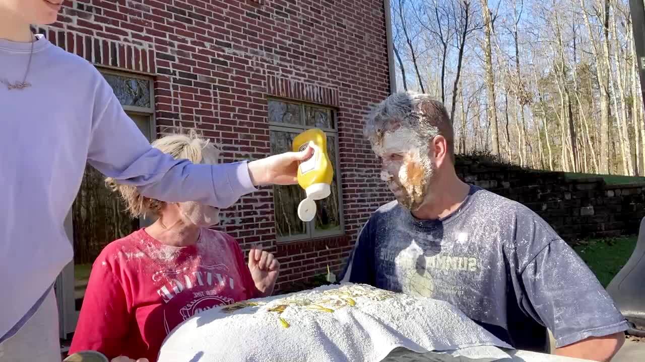 "Rock, Paper, Scissors, Slop-Fest" A man and woman play Rock Paper Scissors, and push each other's faces into a pillow filled with different foods for Thanksgiving. After their faces are covered, they smash their young boy and teen girl's faces into the mess of food in the yard.