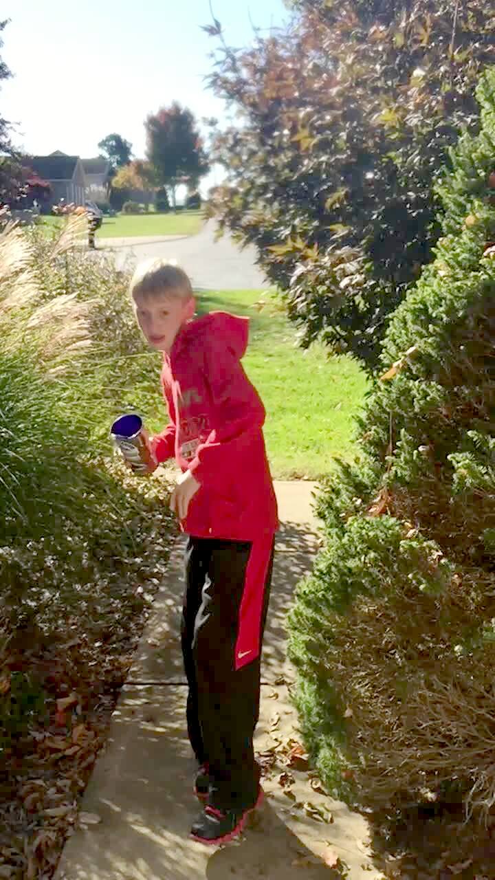 A young boy falls head-first into a flower pot in a front yard, and a young boy laughs while a woman comes out to help him. Security footage.