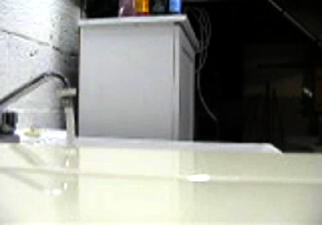 A cat at the veterinarian's office stands on the sink and accidentally activates the automatic soap dispenser. The cat jumps into the air and runs away.