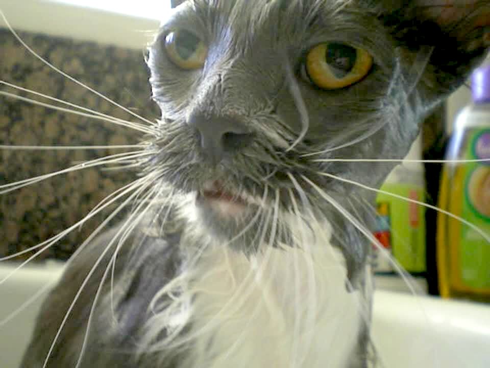 Cat with long whiskers is wet from a bath and keeps saying "no" when asked if it's happy. Pets talking.