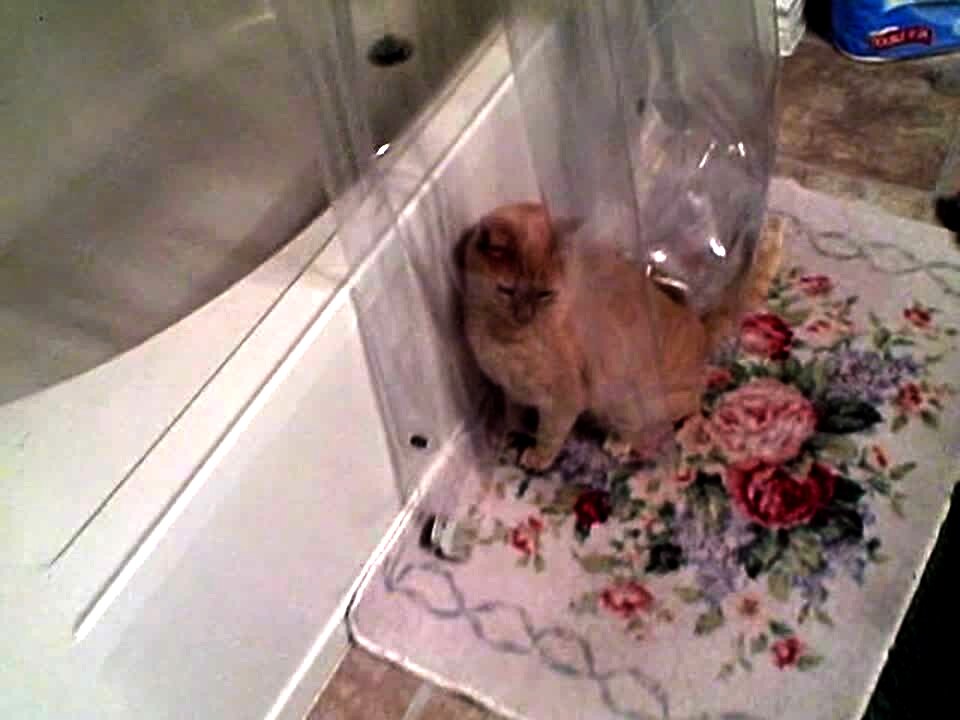 The woman with the camera explains that every morning she gets her shower ready in the bathroom and then moves the curtain to show her cat in the tub. The cat stands on its back legs and licks the water.