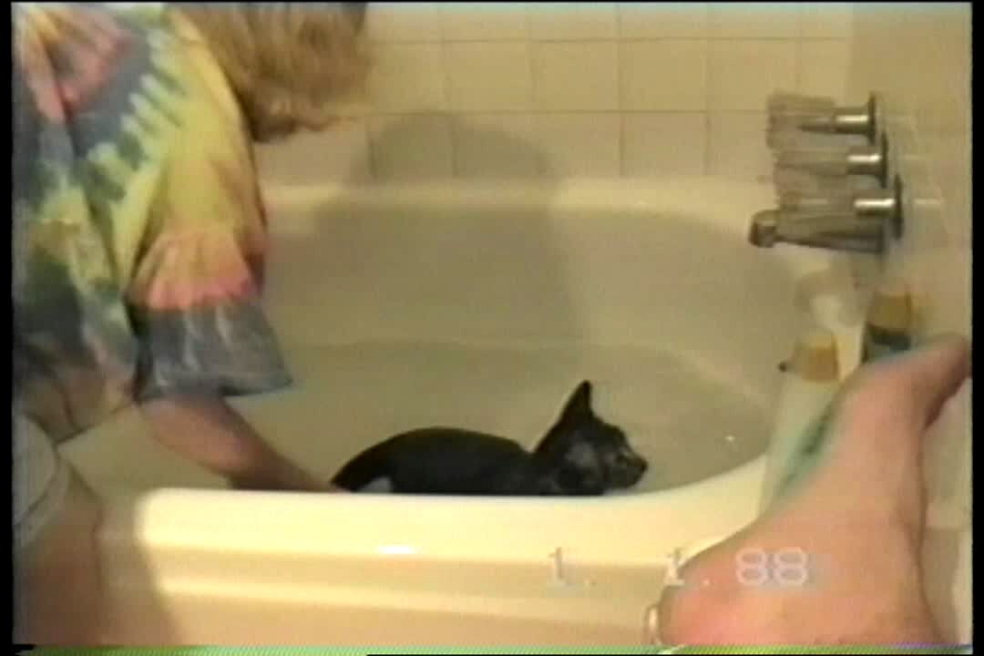 Woman tries to give a cat a bath, sounds like the cat is saying "no." Cat fights woman to get out of the water & yells.