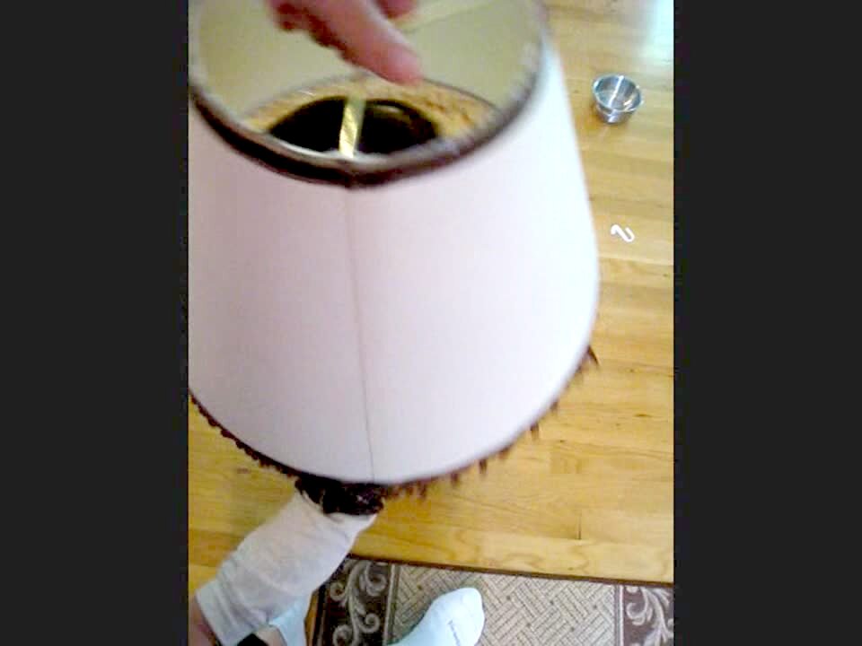Woman puts a lamp shade on a tot boy's head. He walks around a kitchen and bumps into an oven and falls over.