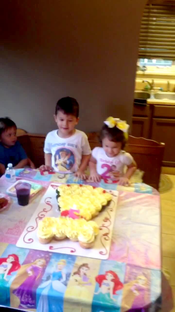 A young boy and girl hold cupcakes with their tot sister for a gender reveal. Their mother asks what they think the gender is before they bite the cupcakes, the boy and girl give their answers, and the camera pans to the tot girl who has already taken a bite of her cupcake.