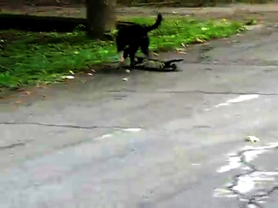 Black and white dog plays with a skateboard and rides on it in the driveway.