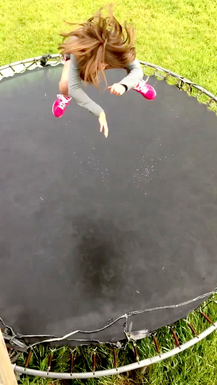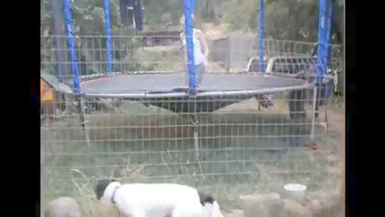 Two girls jump on a trampoline in the yard with a camera under the trampoline and a dog takes the camera and runs away with it. The girls chase the dog to get the phone back, but it doesn't stop for them.