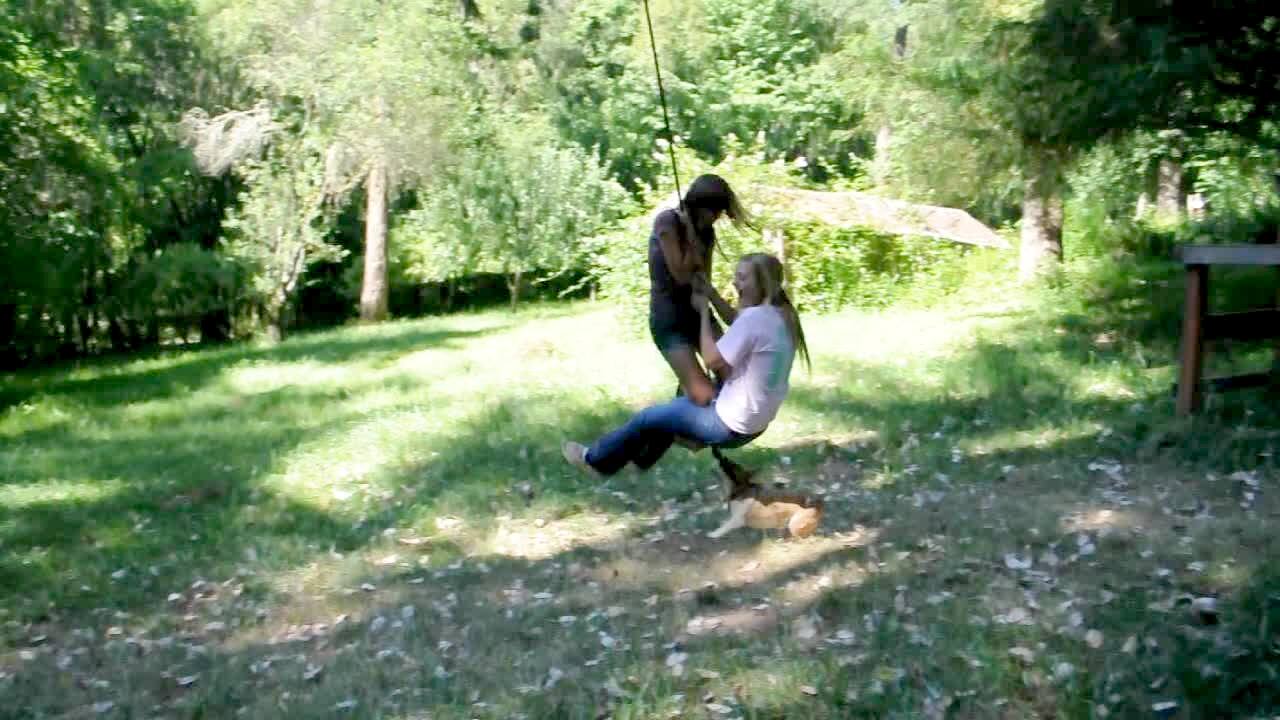 2 teen girls ride on a rope swing in the yard, little brown dog bites onto the bottom of the swing and swings in the air.