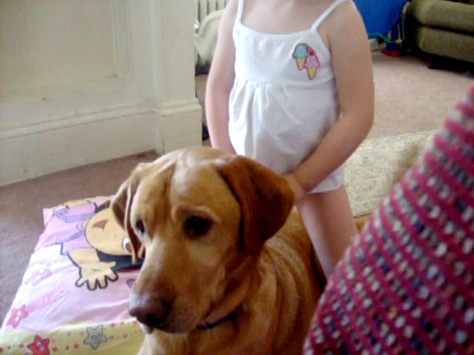 Little girl gets on lab dog's back for ride, dog takes off all of a sudden and girl falls off.