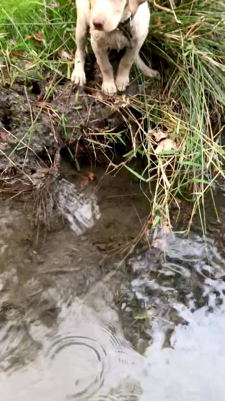 A dog gets scared to go in the water to cross a stream, so a bigger dog that's already in the water steps in front of it and the smaller dog climbs on it and jumps to the other side.