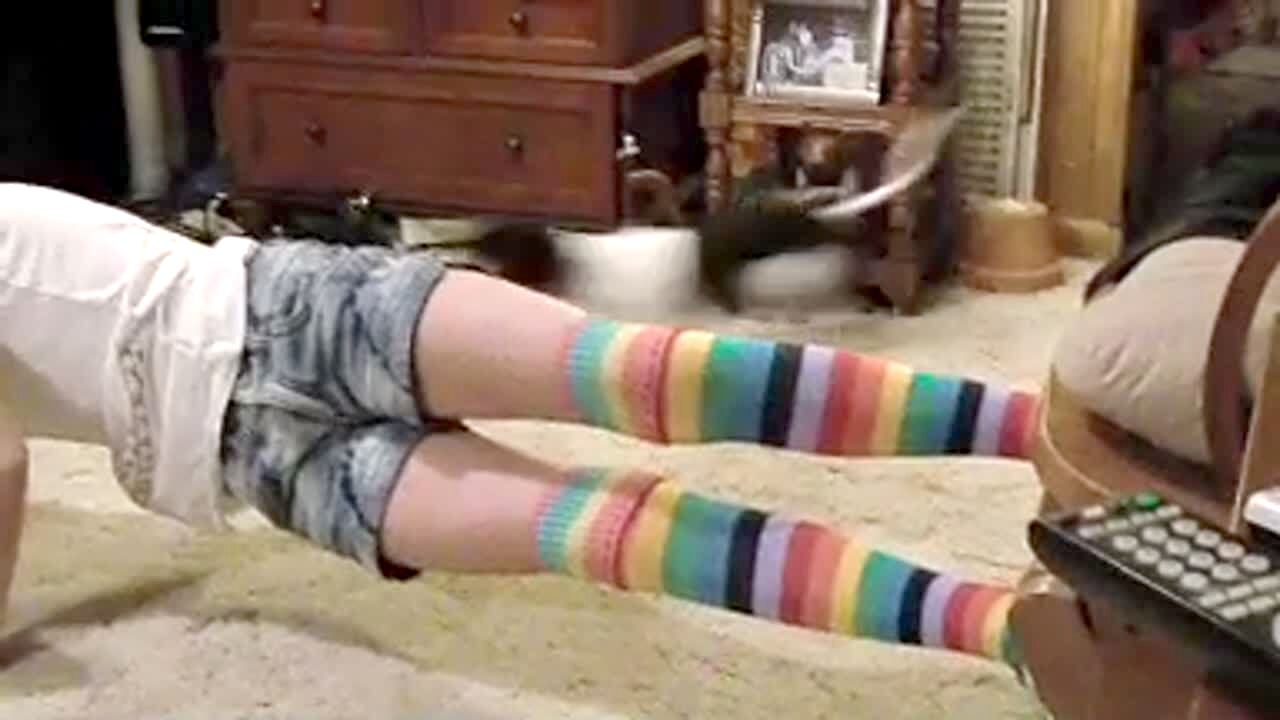 Teen girl wearing rainbow striped socks has Jack Russell terrier dog jump over her legs. Dog eventually jumps through her legs. Silly pet tricks.
