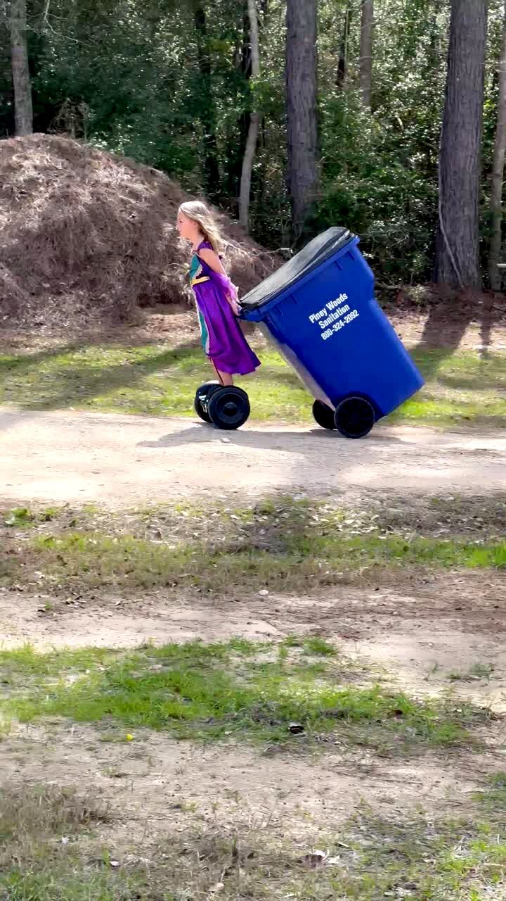A young girl riding a Segway while wearing a princess dress drags a plastic trash bin behind her on a gravel and dirt road