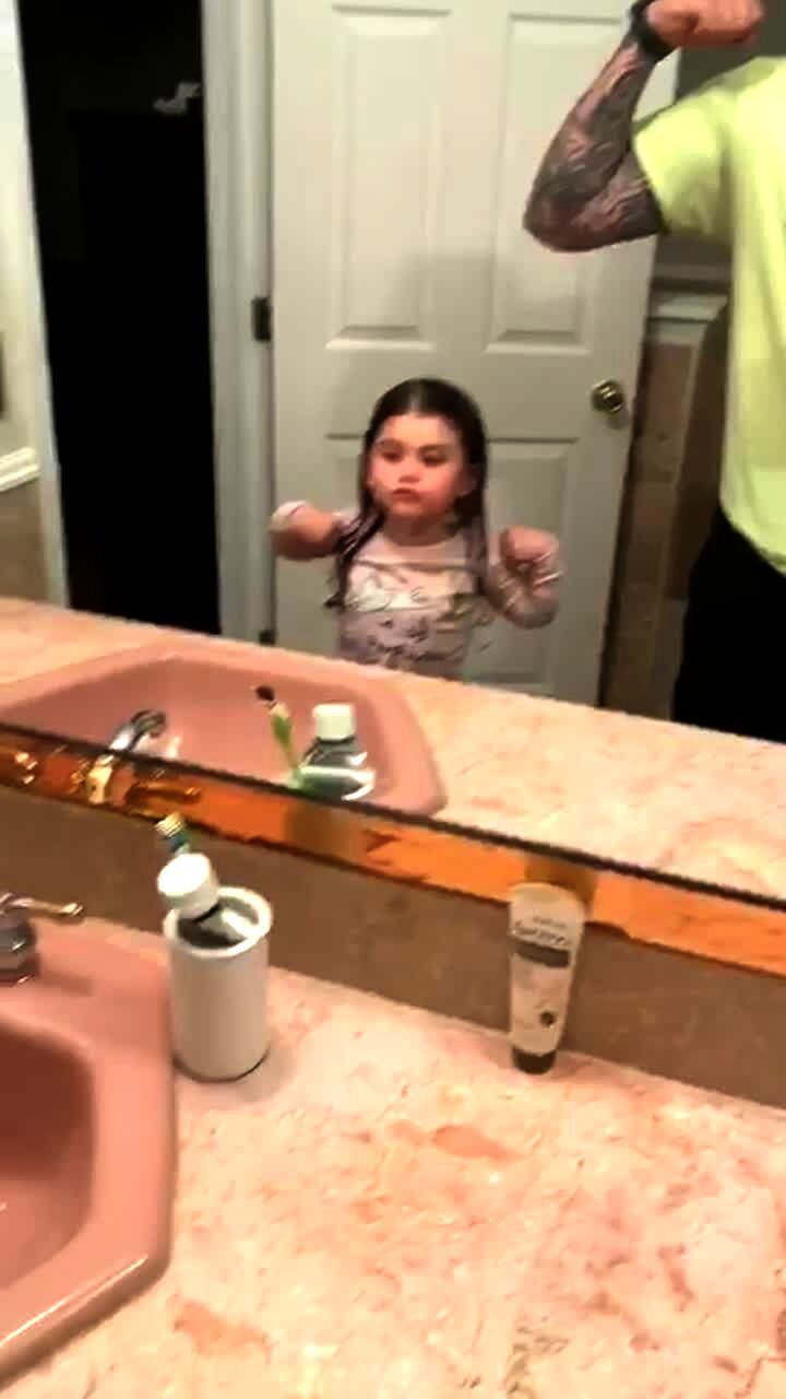 A young girl flexes her muscles in a bathroom and tells her father she's like a chicken.