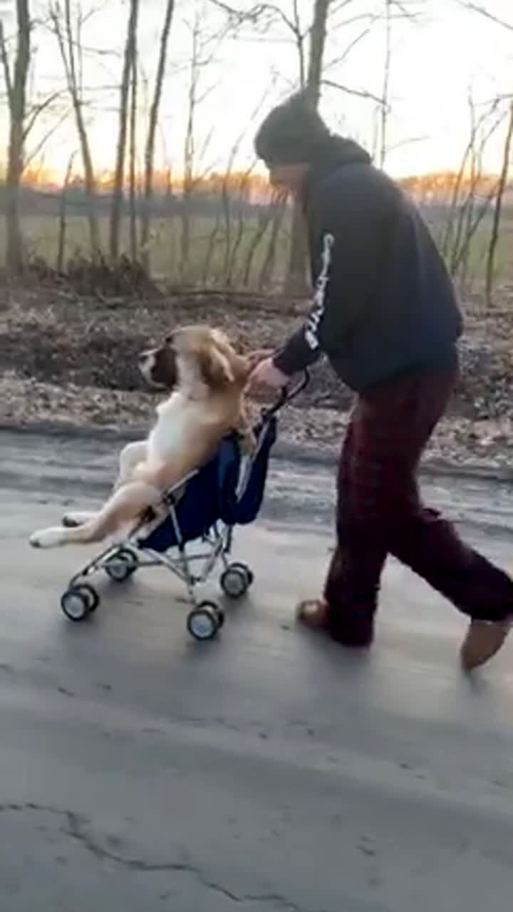 A man pushes a big dog in a stroller down a road. Dog has funny position in stroller