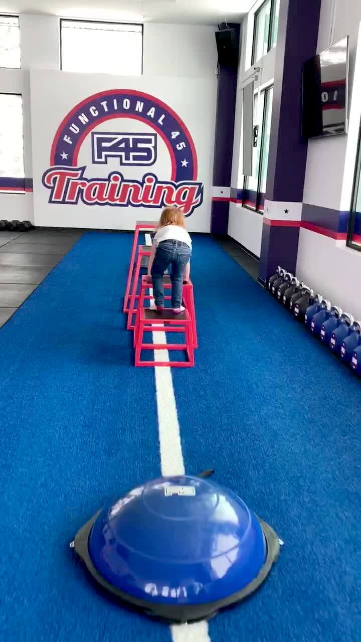 A tot girl runs through an obstacle course, and climbs up an obstacle. A woman tells her to say "I'm so strong", and she says "I'm so scared".