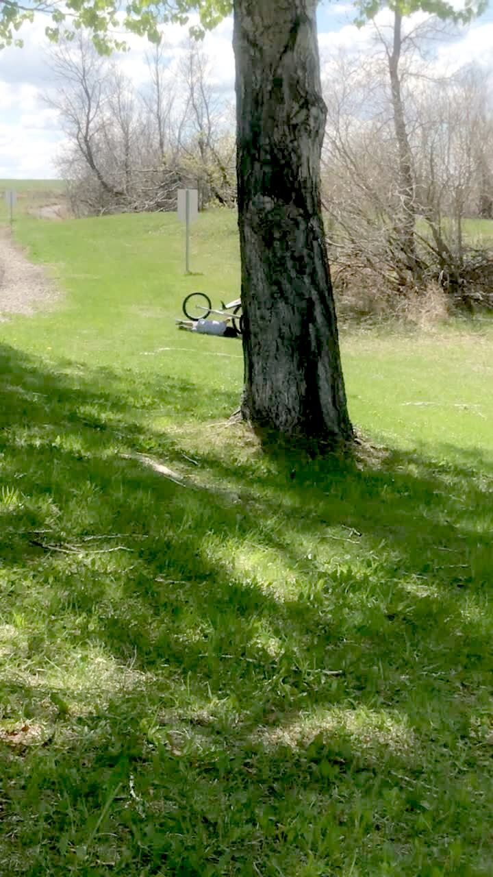 A tot boy pushes a stroller up a hill outdoors, and then falls back as the stroller rolls over him.