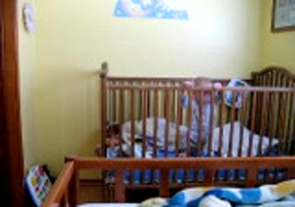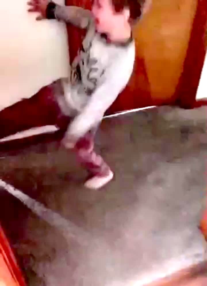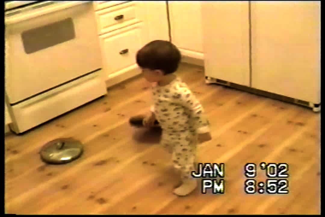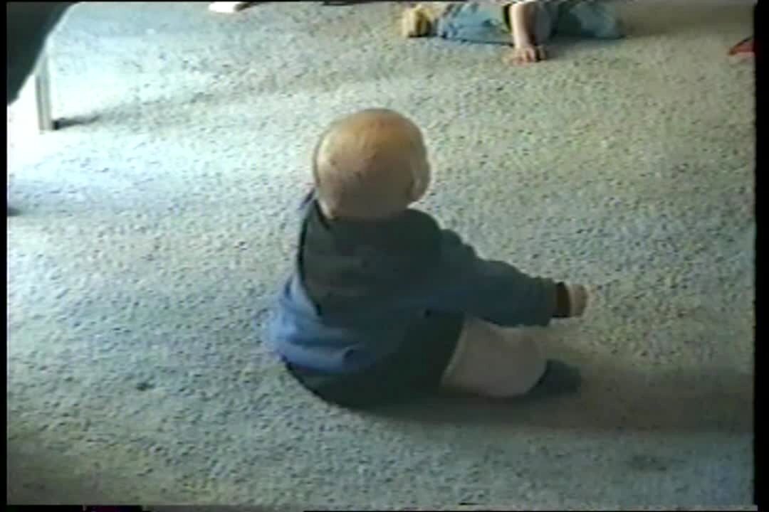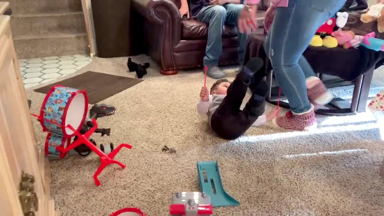 "Shake it Baby" Tot boy has a vibrating bumble ball toy down the front of his pants in the living room. He squeals.