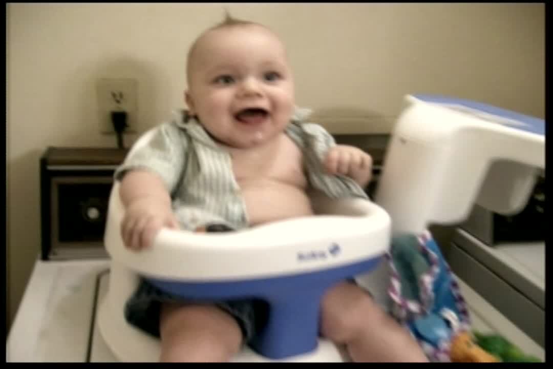 Baby boy sits on top of a clothes dryer. As it runs, baby shakes / jiggles and laughs. Loves it.