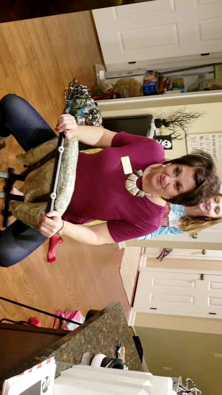 A woman saws wood in a garage and a piece falls down and hits her on the head.