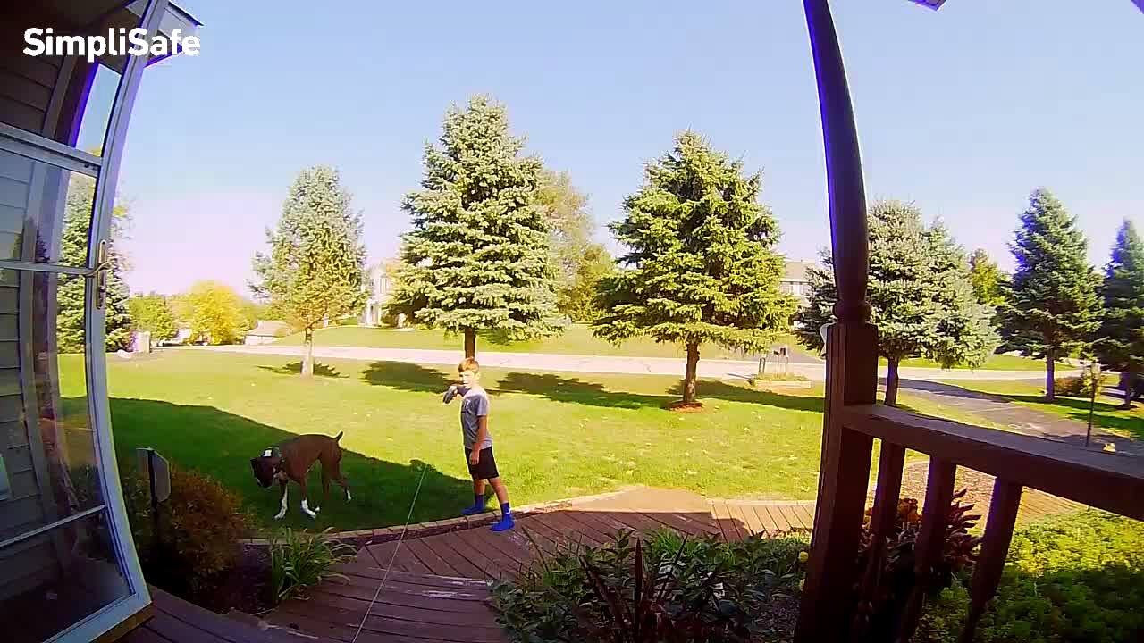 A young boy pulls on a retractable leash and unlocks it when it snaps back into his groin. Security footage.