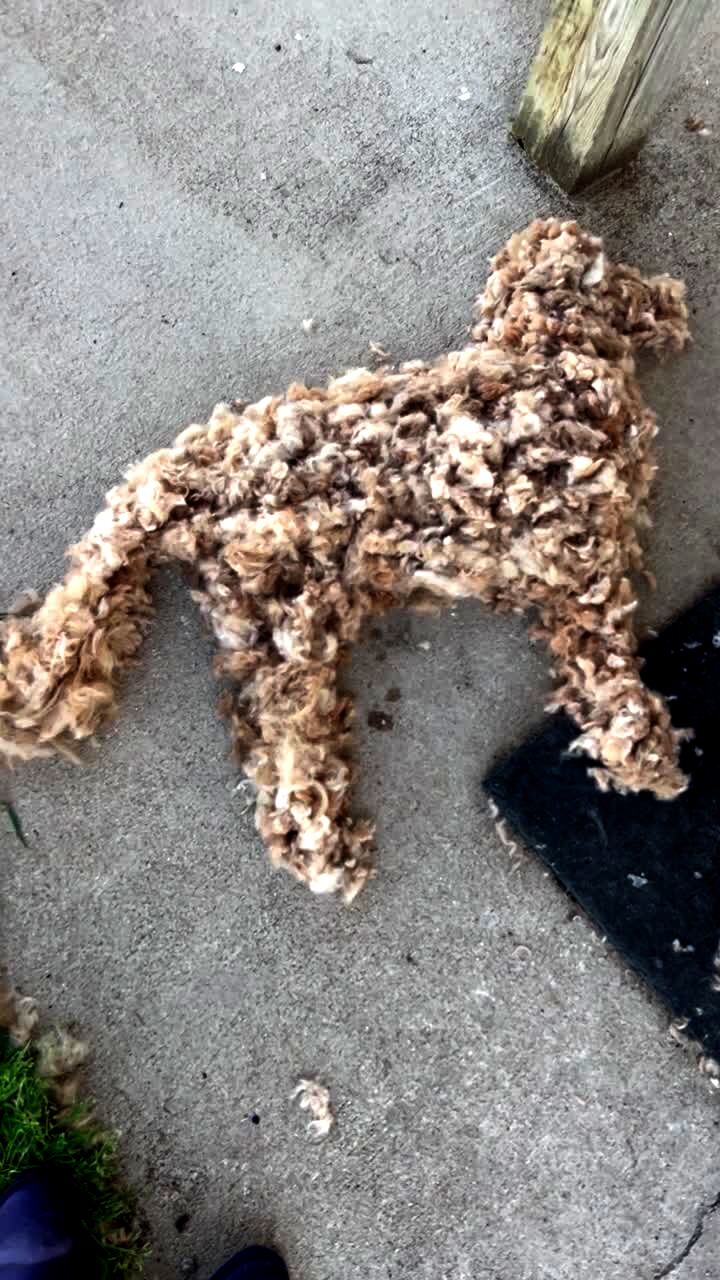 A dog gets groomed with electric hair clippers outside. The camera pans to a pile of fur in the same shape as the dog on the ground next to it.