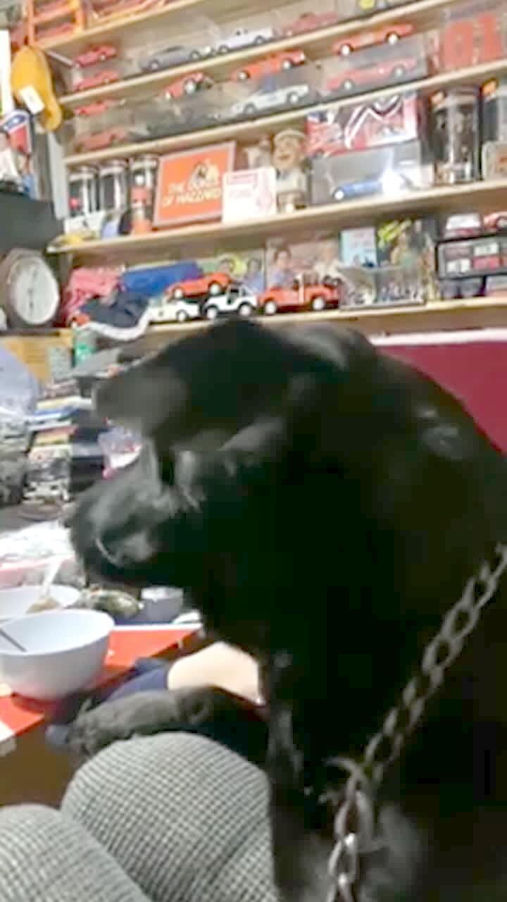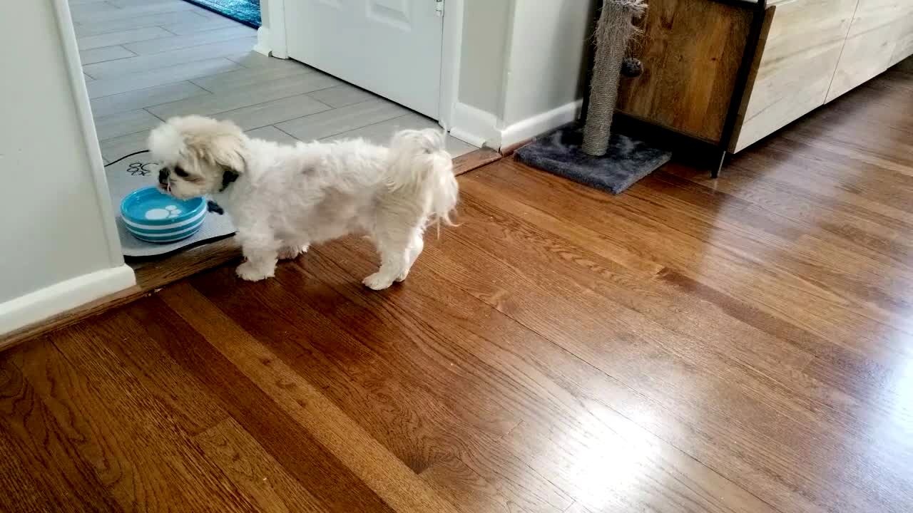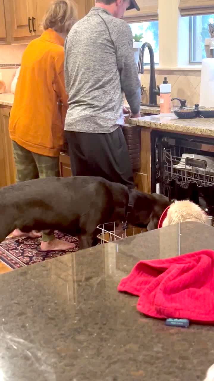 A dog drinks water from a bowl in the kitchen and a man tells it enough and says "back away from the water" and makes beeping sounds and the dog walks backwards away from the bowl.