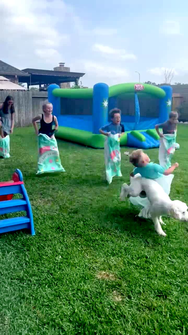 A group of kids does a sack race and a dog hits a tot boy and they fall in the backyard.