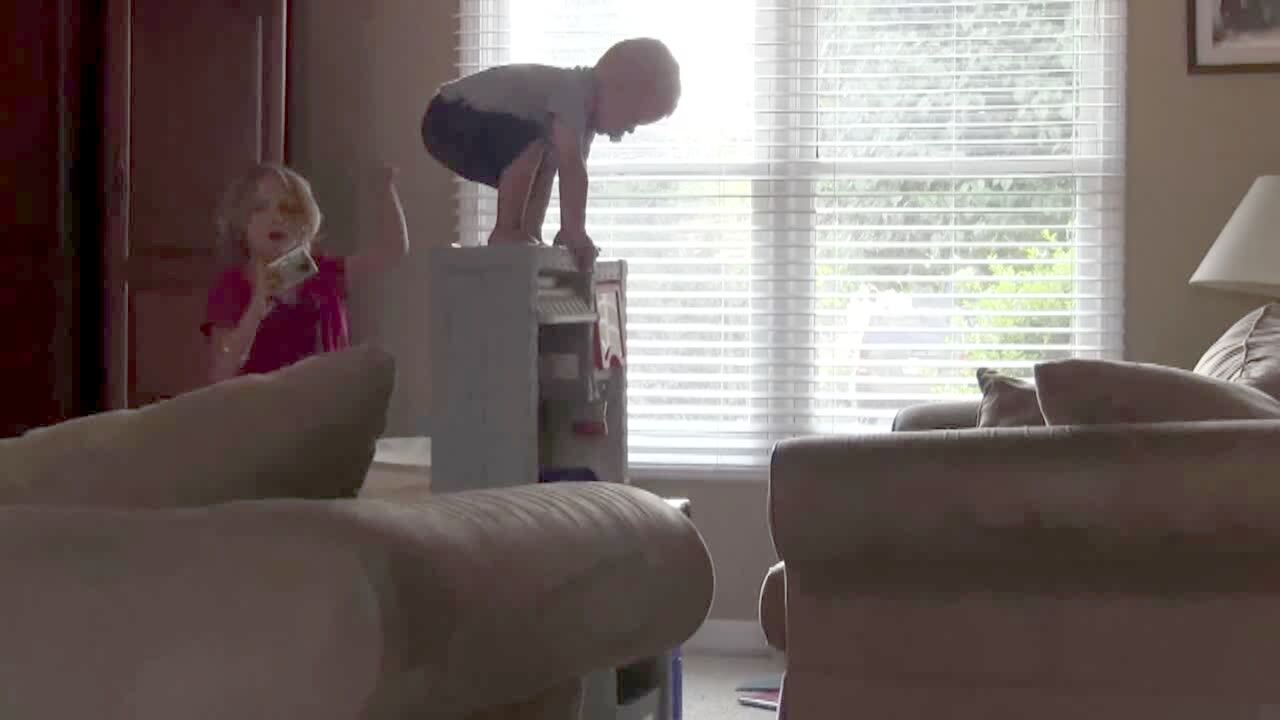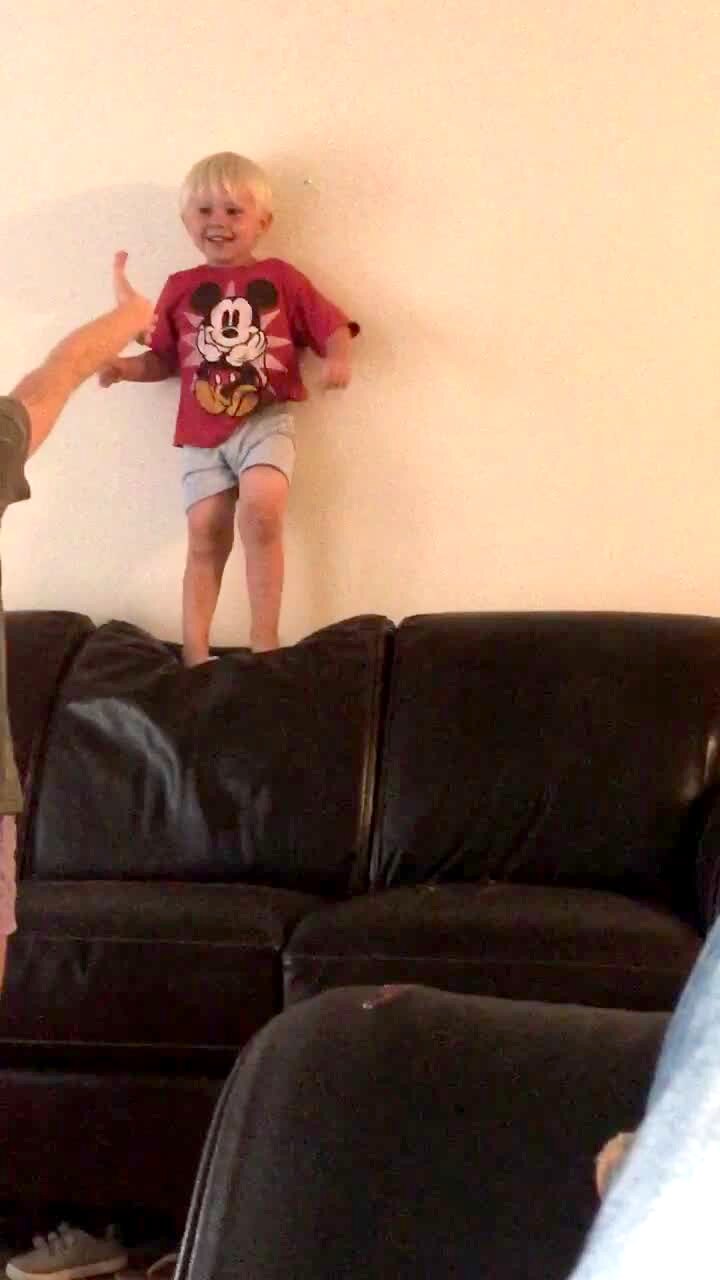 Tot boy climbs up on toy tool bench in living room, tries to jump on couch, comes up short and slams back into tool bench. Caucasian. UGC-EP experienced an error.