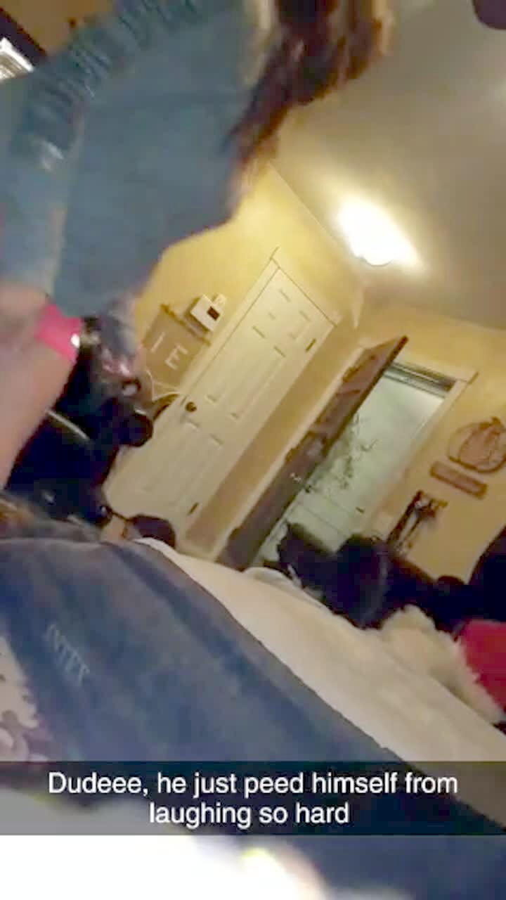 Teen girl does backflips on the bed, she lands the first time but falls off the bed on the 2nd try. A TV set falls on her head.