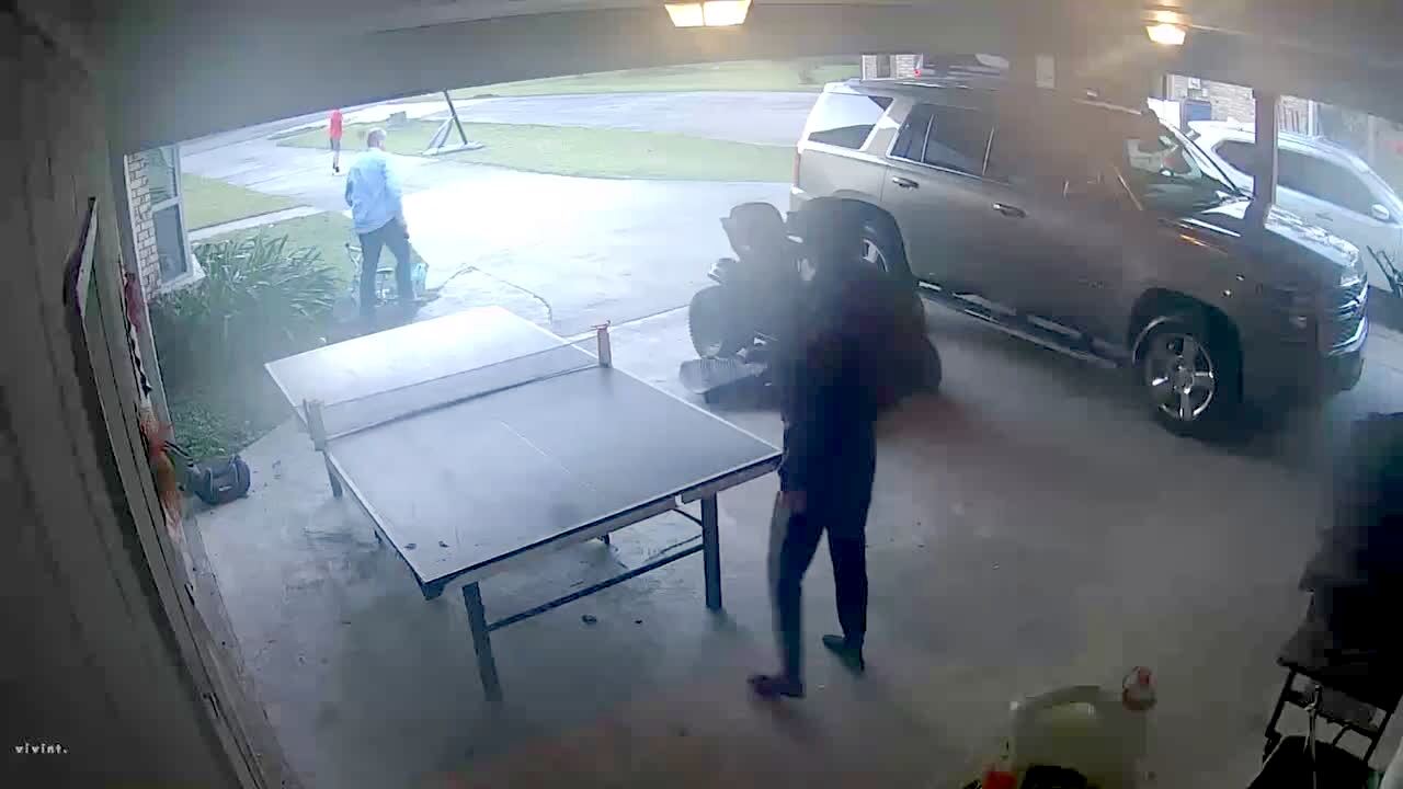 A teen boy and a man volley on a ping pong table in the garage. The boy spikes the ping bong ball and the man steps backward and stumbles over a bicycle and falls in the driveway. Security footage.