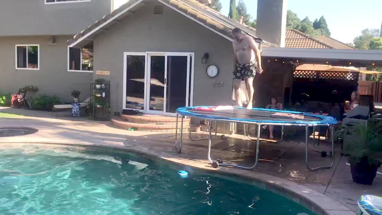 A man tries to jump from the trampoline into the above-ground pool but he doesn't make it all the way and he lands on the pool wall with his groin.