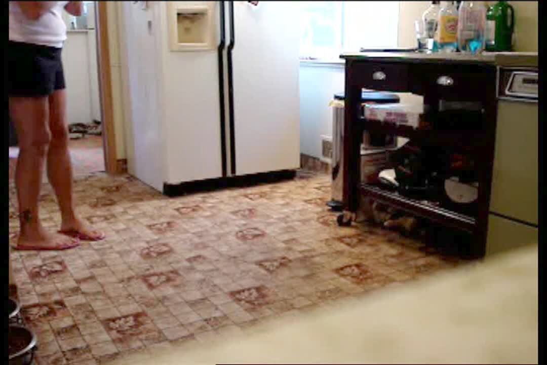 A woman tells a man in a crouched position to quickly put his elbows behind his back, then he falls on his face as she stays elevated in a living room.