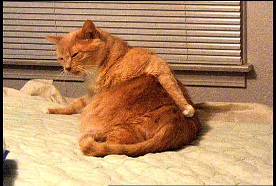 Woman shows a cat, a dog, and her husband all napping. The reveal is her husband in his underwear sleeping with an eye mask on.