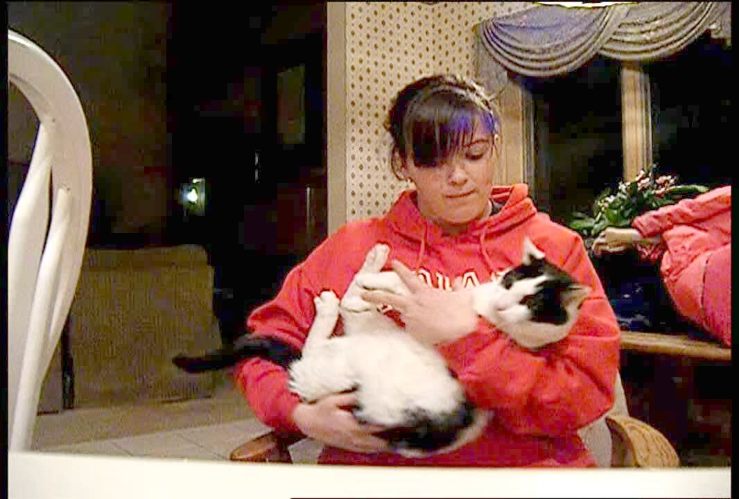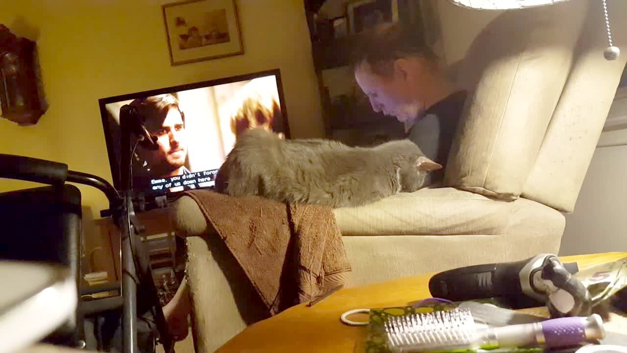 Woman holds her cat & sings "Rockabye Baby." Cat meows at specific points.