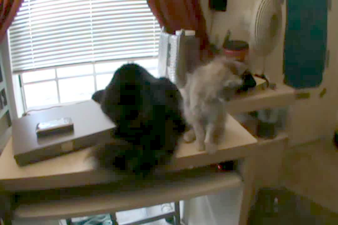 Two cats on a table, one plays with the black cat's tail. The black cat gets tired of it and knocks the other cat off the table. (2103)