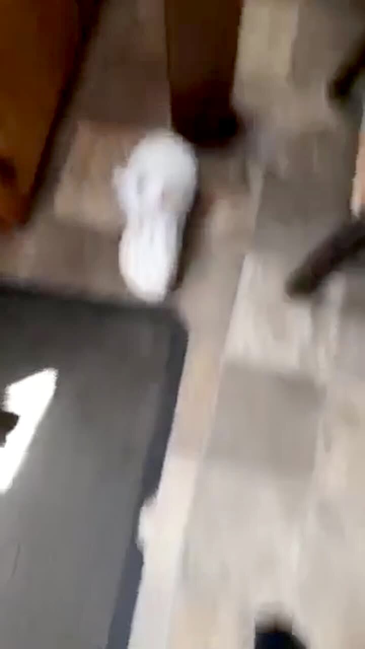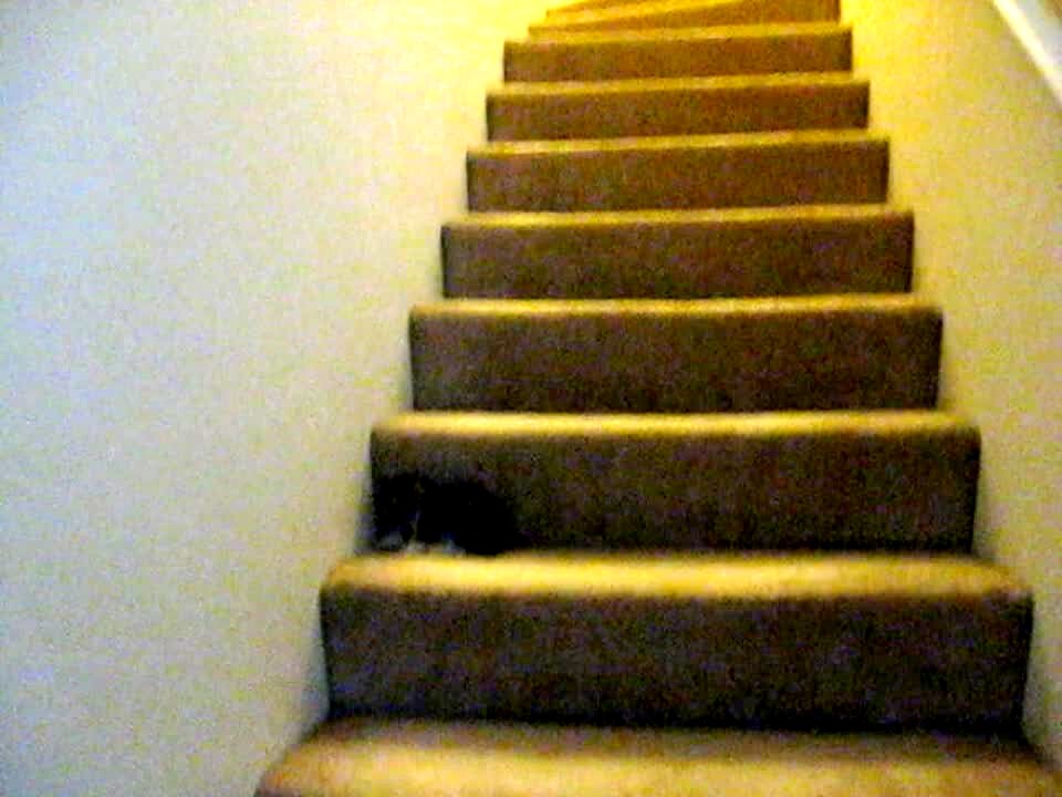 Kitten falls / tumbles down some stairs. Happens immediately, no heads. Cats.