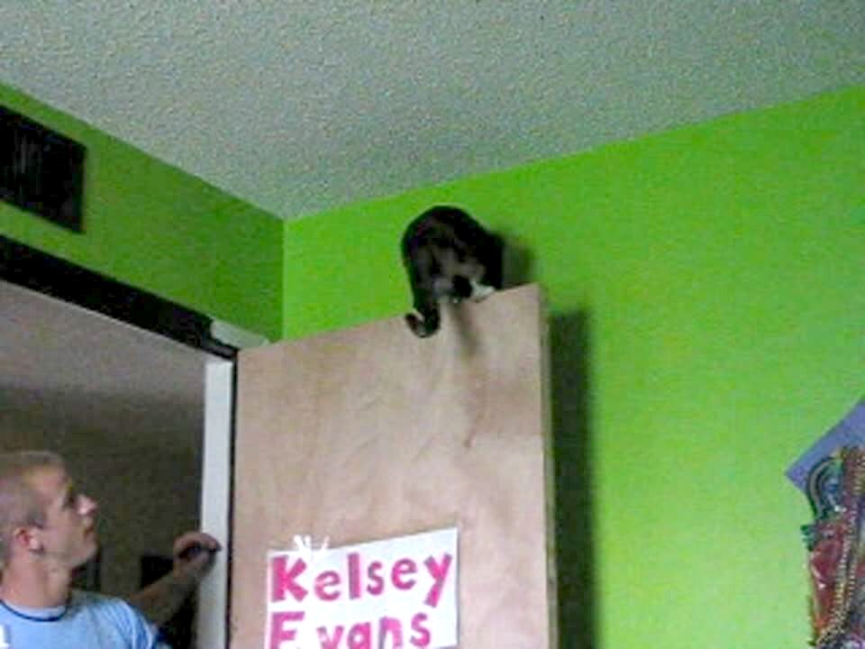 Cat stands on top of a door in a bedroom. Suddenly, the cat slips off the door, hangs from it, and falls.