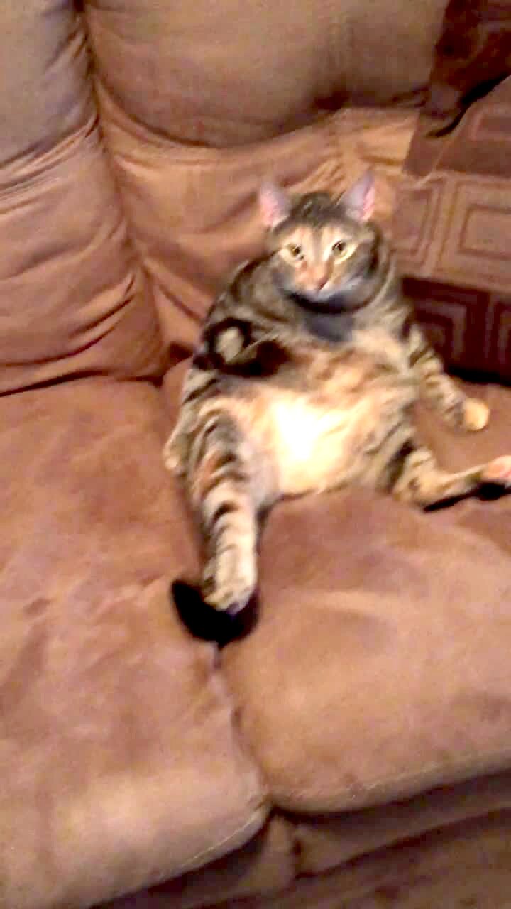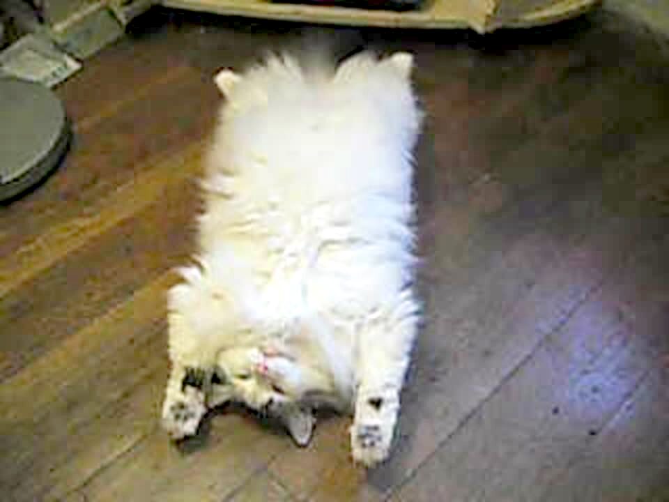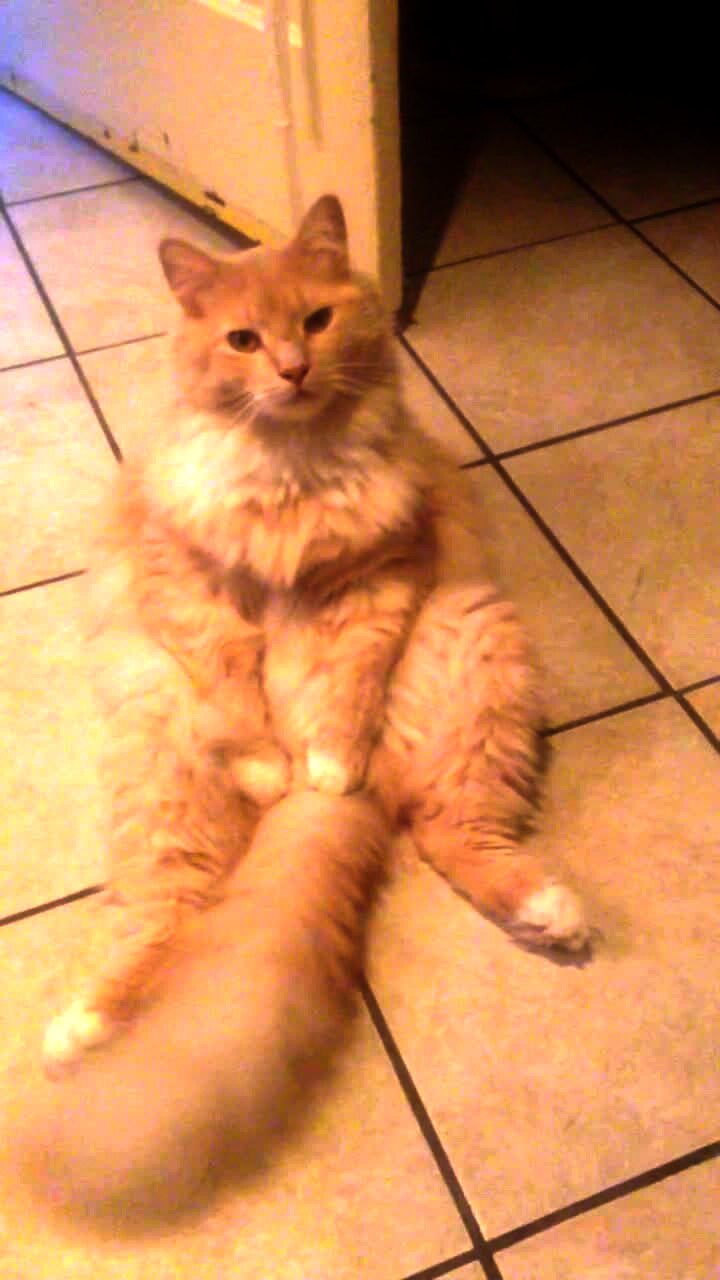 A fluffy cat sits upright on the floor like a human and casually wags his tail indoors.
