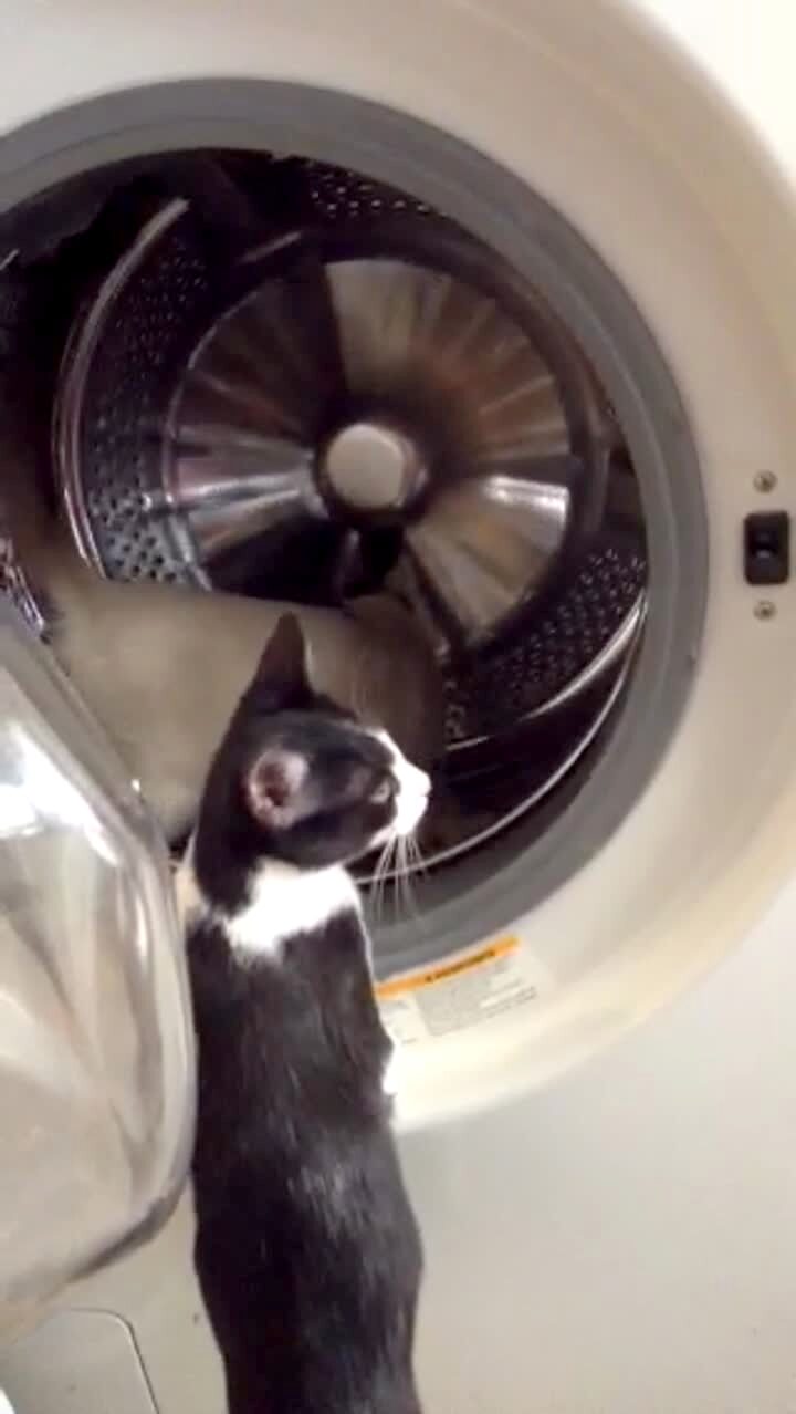 A calico cat walks in a laundry machine as though it's a hamster wheel indoors.