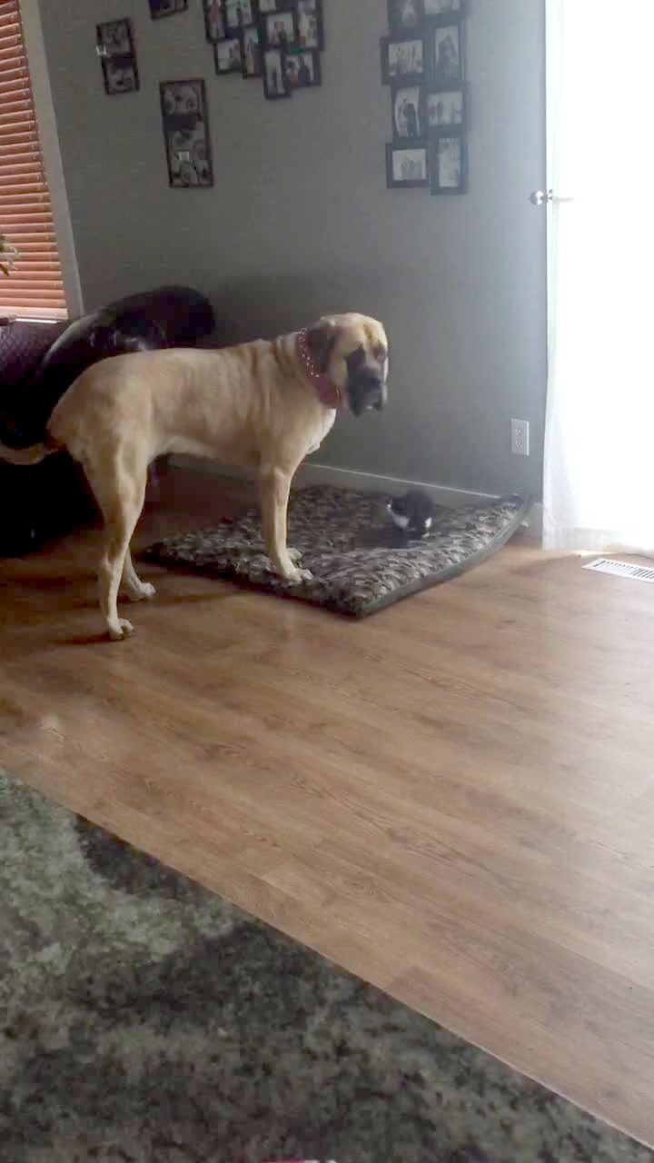 A large dog sits on a kitten cat indoors and the cat meows loudly.
