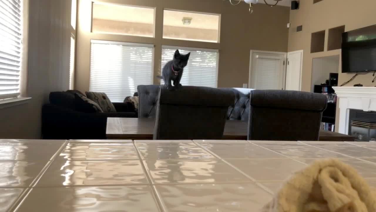 A kitten cat tries to jump from a chair to a kitchen island, but doesn't jump far enough and falls down.