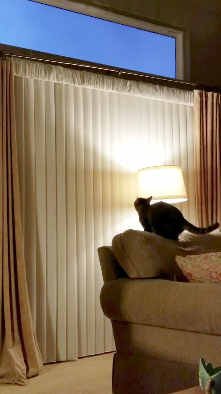 A cat jumps on a window shade. It hits the window shade pole and the cat and the pole both fall down.